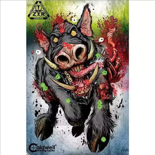 O alvo Caldwell Flake Off - Javali Zombie é ideal para o atirador que procura um alvo temático e diferente para atirar, feito em duas camadas, seu sistema de metas ZTR indica três cores diferentes (vermelho, verde e branco) onde cada cor indica o acerto do tiro no alvo, sendo esses, vermelho para headshots, verde para o corpo, e branco para o restante do alvo, facilitando a visibilidade do acerto à grandes distâncias.