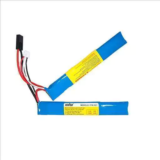 Bateria para airsofts Feasso modelo Lithium Polimer (LIPO). Modelo de duas células com conector mini tamiya, 7,4volts da saida, carga de 1500 mAh e taxa de descaraga de 15Coulumbs.