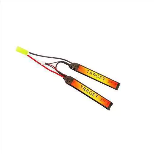 Bateria para airsofts Target modelo Lithium Polimer (LIPO). Modelo de 2 células com conector mini tamiya, 7,4 Volts de saida, carga de 1200 mAh e taxa de descaraga de 20 Coulumbs.