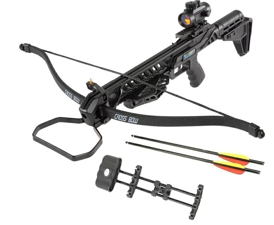Kit completo com: mira ótica (Luneta 4x32mm), 3 unidades de setas Barnett (sem ponta) e aljava (quiver).