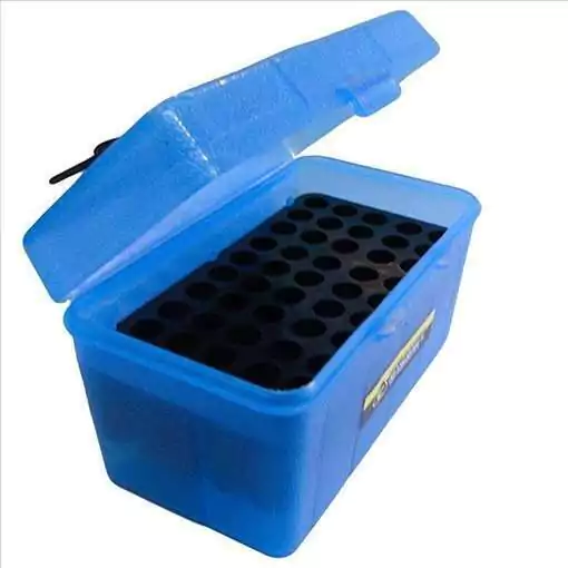 Caixa plástica MTM super resistente com excelente acabamento, com capacidade para 50 cartuchos medios calibre (308). Contém compartimento antichoque e com alca para facilitar o transporte.