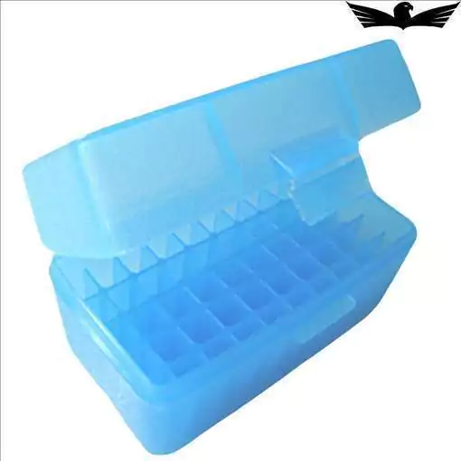 Caixa plástica MTM super resistente com excelente acabamento, com capacidade para 50 cartuchos curtos calibre (223)