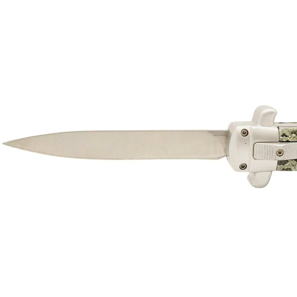 O Canivete Automático Tipo Punhal Cobra combina agilidade, resistência e design marcante para quem busca um equipamento funcional e estiloso. Sua lâmina em aço 440 garante cortes precisos e alta durabilidade, enquanto o cabo em polímero com acabamento imitando pele de cobra oferece pegada firme e visual diferenciado. Possui abertura automática acionada por botão e trava de segurança, garantindo uso rápido e seguro. Para manter o bom funcionamento, recomenda-se lubrificar a junção da lâmina com o cabo periodicamente.