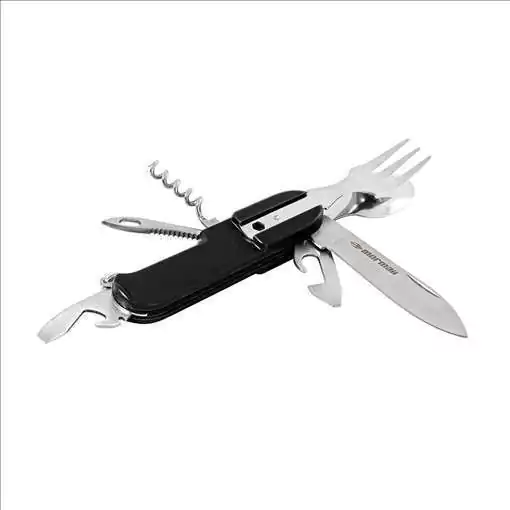 Desenvolvido em Plástico ABS com lâminas em Aço Inox 420, com as funções: faca, colher, garfo, abridor de garrafas, abridor de lata, saca-rolhas, chave de fenda e punção com orifício.