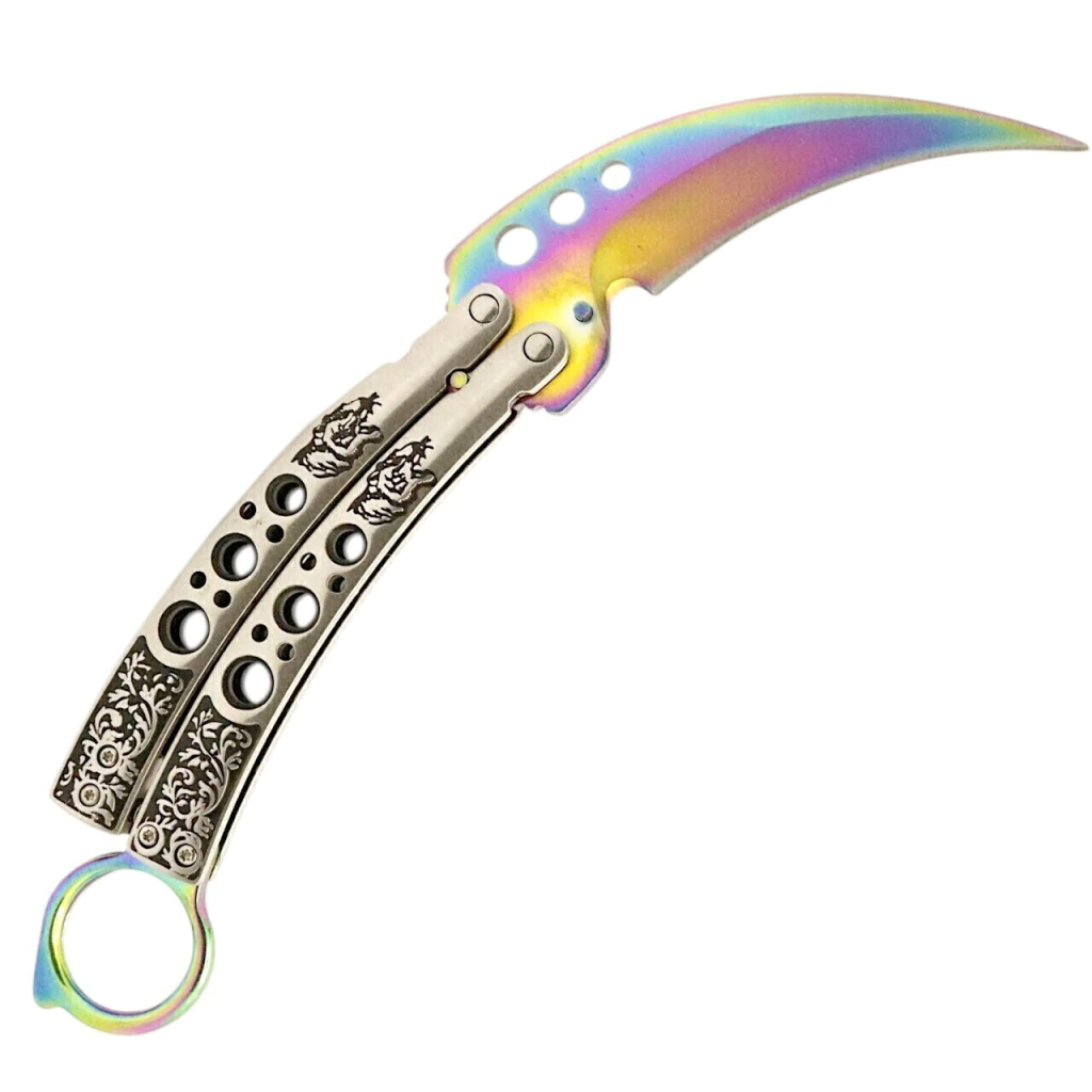 O Canivete Tático Butterfly e Karambit - Fade é fabricado em aço 440 de alta resistência, garantindo durabilidade e corte eficiente. Possui lâmina lisa de 7 cm com espessura de 3 mm e empunhadura em metal na elegante cor fade. A abertura é manual.