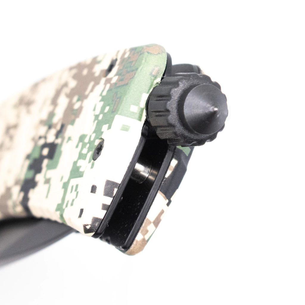 Cabo ergonômico camuflado: conforto e pegada firme em uso prolongado.