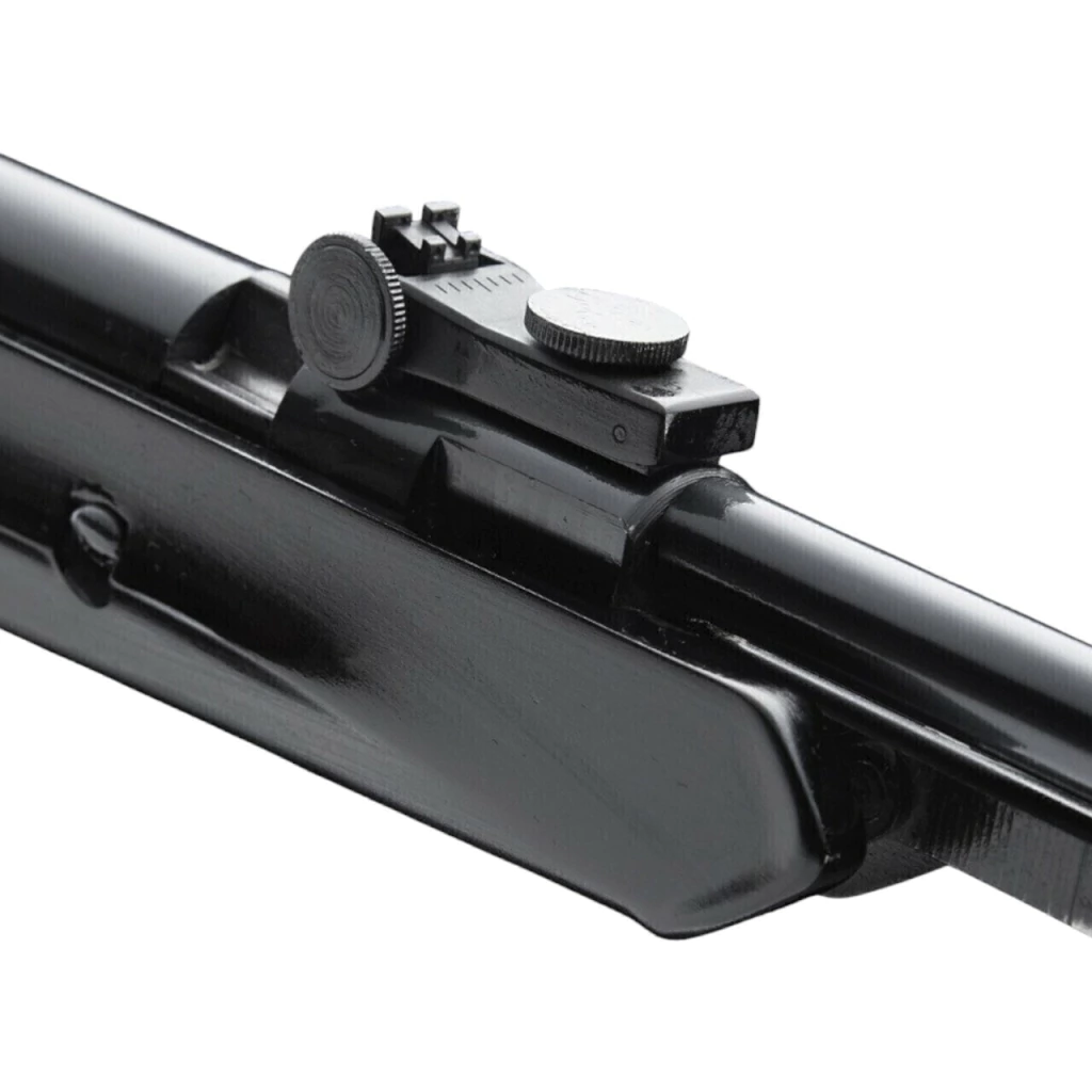 Conta com conjunto de mira aberta com fibra óptica, massa de mira fixa e alça ajustável, além de trilho de 11mm estilo rabo de andorinha, permitindo instalação de acessórios como lunetas e red dots.