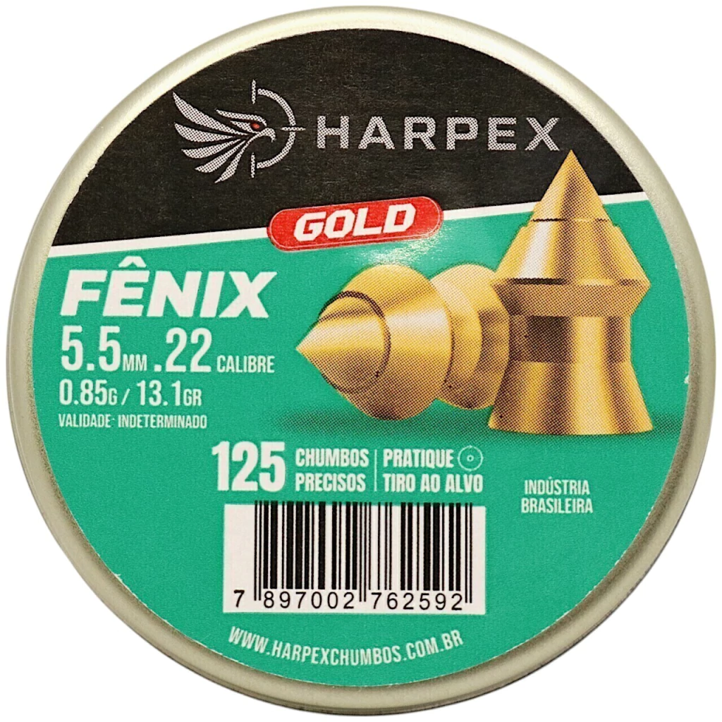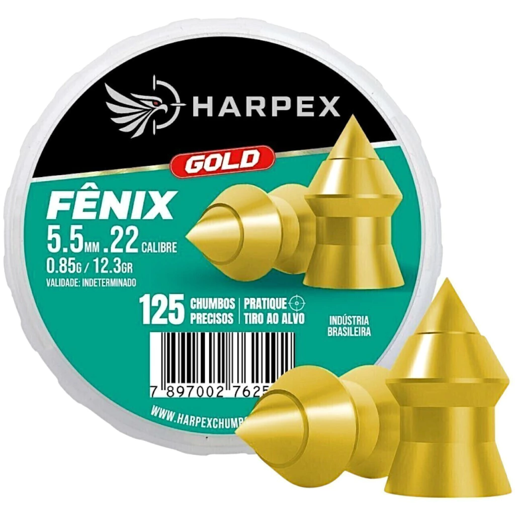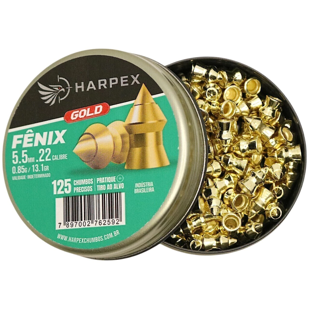O Chumbinho Harpex Fênix Gold 5.5mm é a escolha ideal para atiradores que buscam penetração eficiente, precisão e alto desempenho em cada disparo. Desenvolvido para tiro esportivo, caça legalizada e controle de pragas, seu design aerodinâmico com ponta pontiaguda e acabamento dourado oferece excelente estabilidade em voo e impacto elevado.