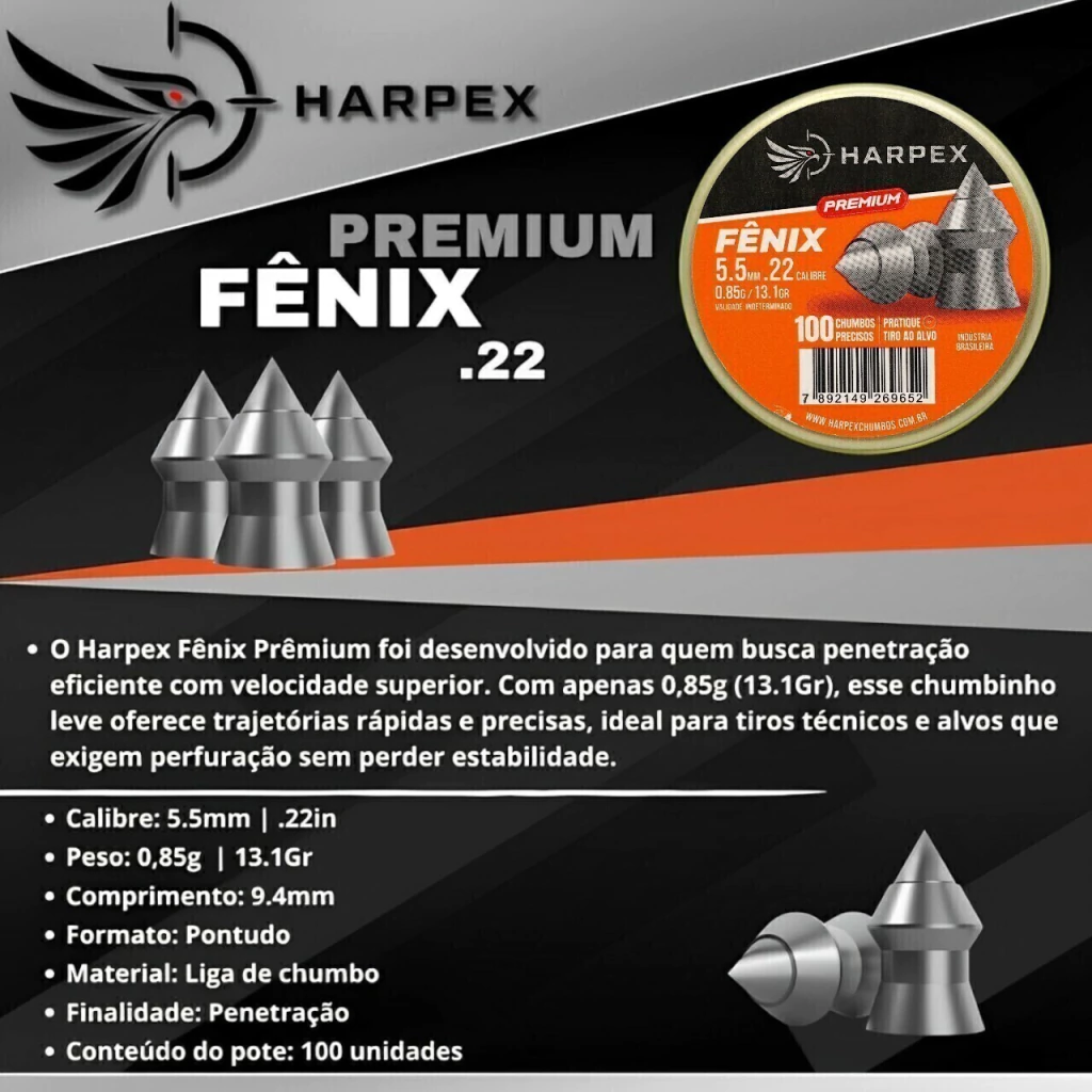 O Chumbinho Harpex Fênix Premium 5.5mm foi projetado para quem busca potência, precisão e penetração superior em cada disparo. Ideal para tiro esportivo, controle de pragas e caça legalizada, oferece um desempenho profissional graças ao seu design aerodinâmico e acabamento refinado.
