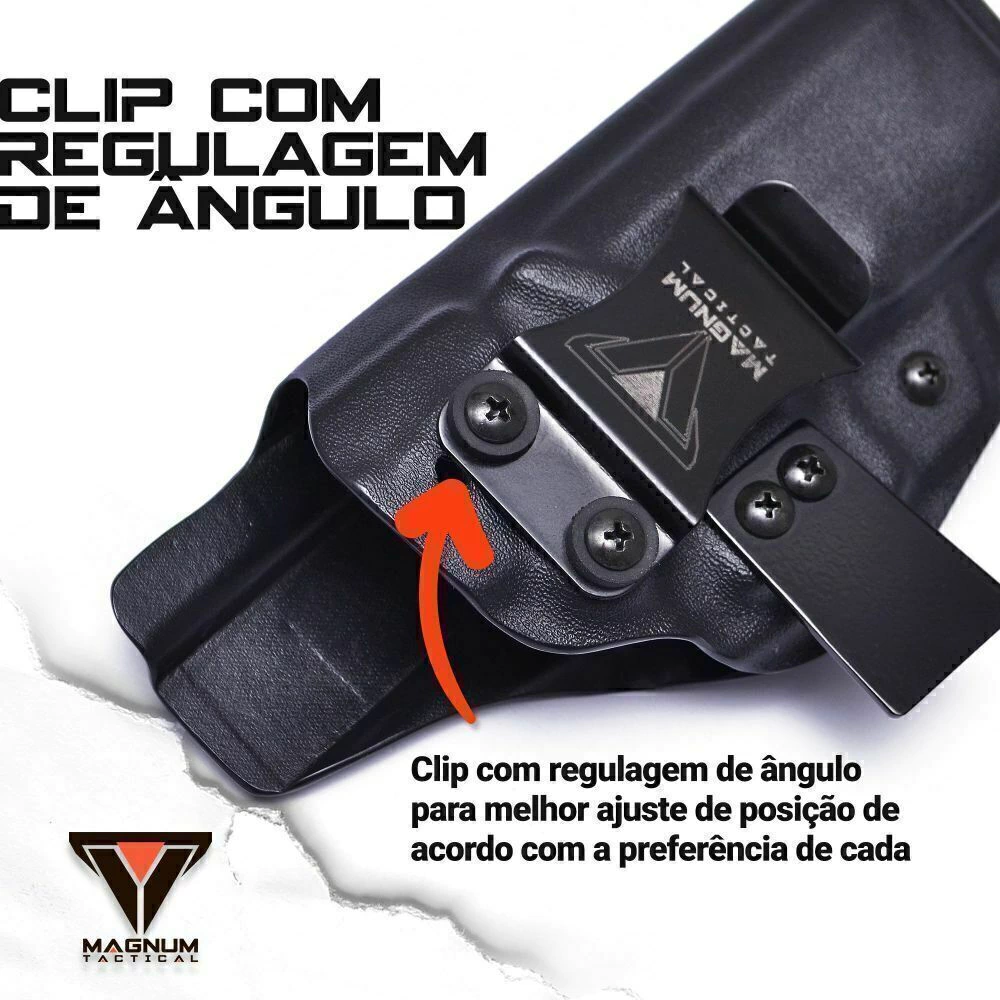 Seu design slim e discreto torna-o perfeito para porte IWB (interno), proporcionando ocultação eficiente sem comprometer a rapidez no saque. O acabamento polido protege a arma contra desgaste, suor e atrito direto com o corpo, mantendo sua pistola sempre preservada.