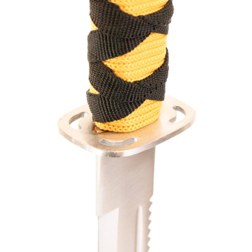 Sua lâmina de aço inoxidável de 50 cm garante resistência à corrosão, maior durabilidade e facilidade na manutenção. O cabo de 20 cm, feito em aço com revestimento em nylon trançado, proporciona uma pegada firme, ergonômica e segura, perfeita para treinos de movimentos, manuseio ou exposição.
