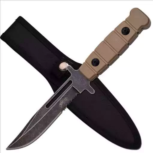 Faca full tang Master USA, modelo MU-1125DT, guarda dupla clip point tala desert . Contém lâmina lisa e serrilhada em aço inox. Empunhadura com revestimento em polímero na cor desert. Acompanha bainha de nylon.