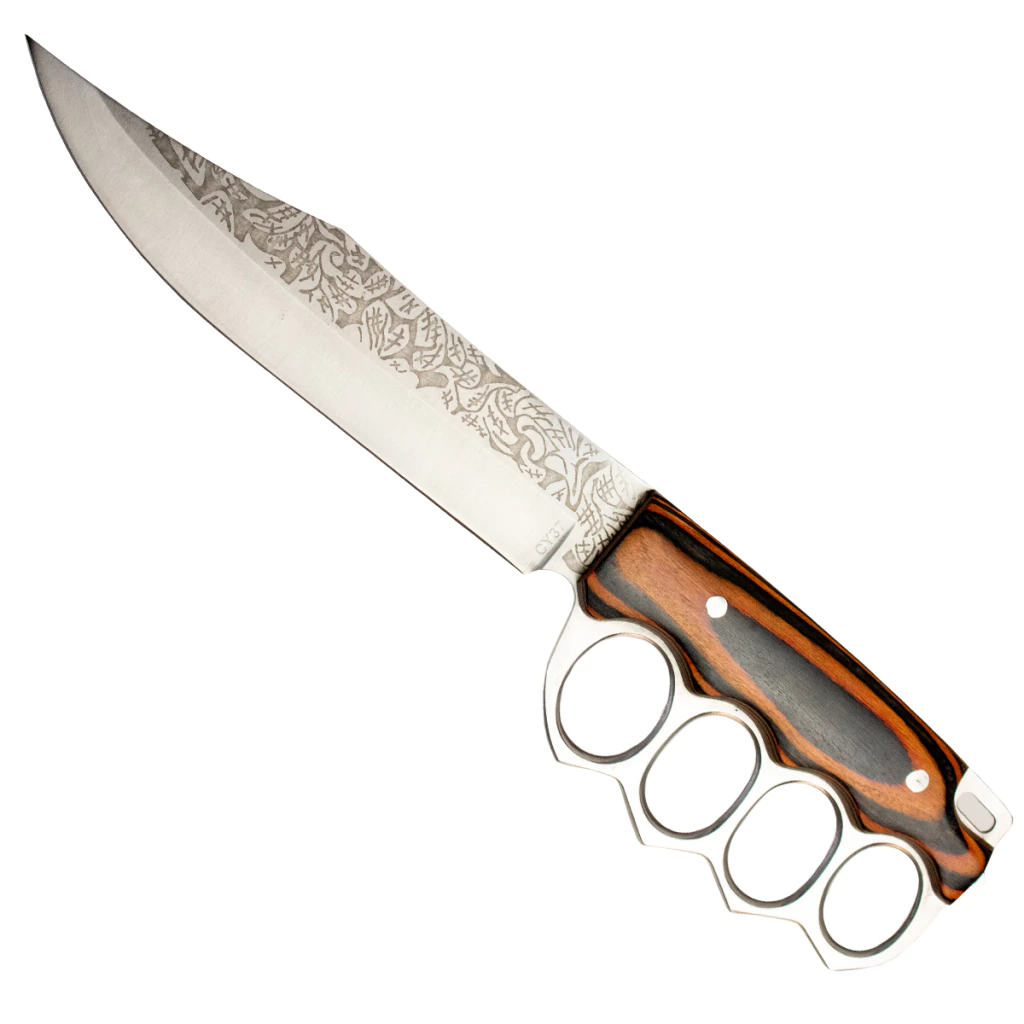 O grande diferencial do modelo está no soco inglês integrado ao cabo, que proporciona maior firmeza na pegada e uma camada extra de segurança em ambientes de risco. A lâmina é produzida em aço inoxidável, com acabamento que simula o tradicional padrão Damasco, conhecido pelas ondulações que remetem a técnicas milenares de forjamento.