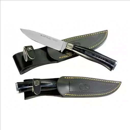 Faca esportiva estilo punhal, com lâmina em aço Molibdênio Vanádio, ricasso reforçado, separador em alpaca e pomo em aço, cabo inteiriço de micarta. Acompanha bainha de couro preto.