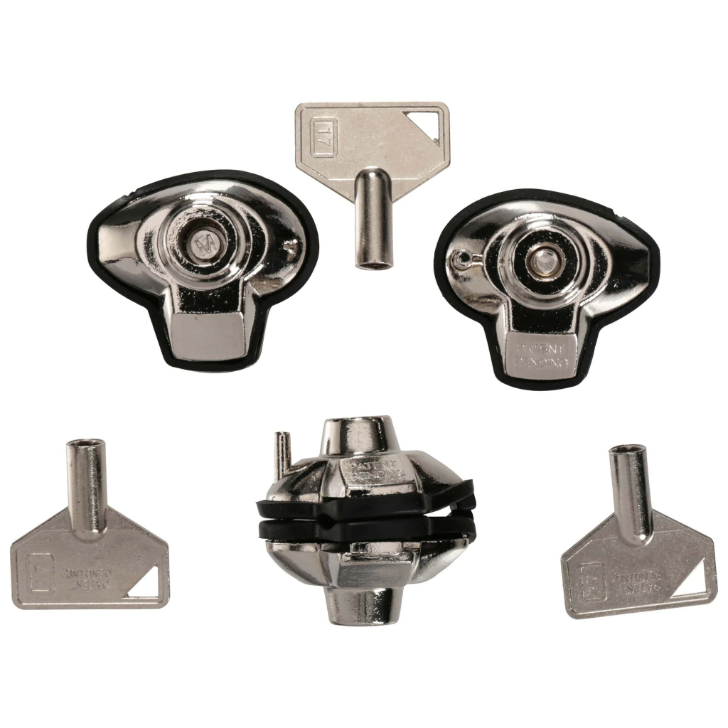 Cada trava possui protetores de borracha que protegem o acabamento do guarda-mato, garantindo um encaixe firme sem arranhões. Todas as três travas vêm com a mesma chave, oferecendo praticidade e organização no uso diário ou em transporte seguro.