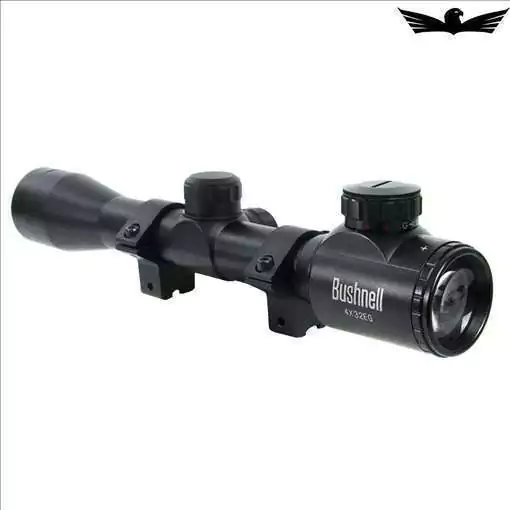 Luneta 4x32EG Bushnell para carabinas de pressão de média potência. Retículo luminoso verde e vermelho de silicone tipo crossbow para uma melhor precisão nos tiros a longa distância. 5 intensidades na iluminação do retículo.