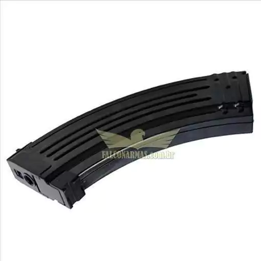 Magazine Hi-cap para 470 bbs, com opção de corda rápida, na qual se puxa um corda na parte inferior do mag, alimentando instantaneamente a flexão do carregador, dando maior agilidade no carregamento.