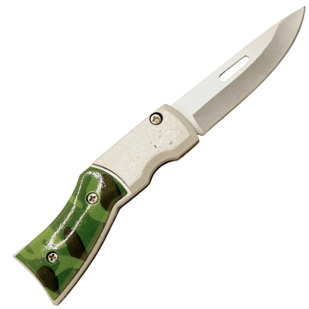 Mini Canivete Empunhadura Metal Com Bussola e detalhe em plástico com detalhes camuflado com mini bussola, sistema de saque automático com trava.