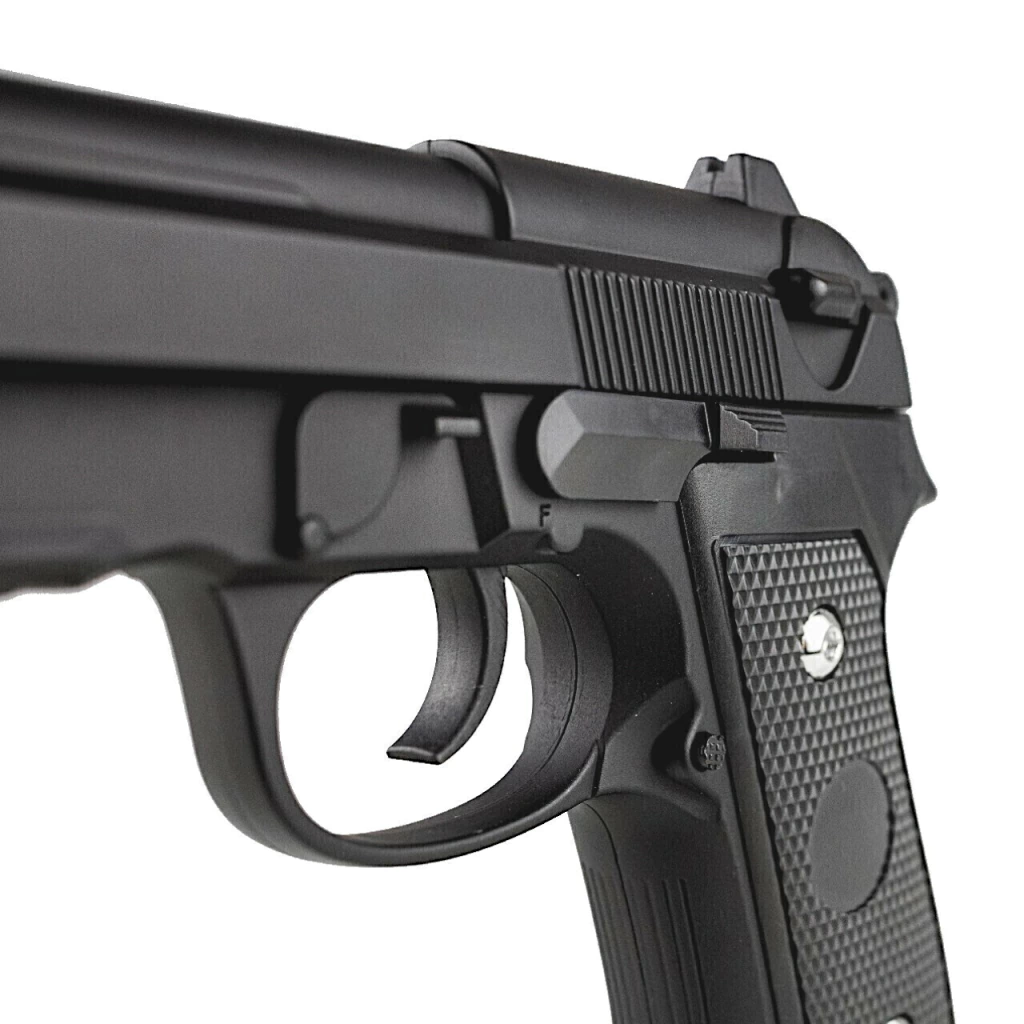 Possui corpo em metal e polímero, empunhadura ergonômica texturizada e ferrolho móvel, oferecendo uma experiência mais realista. Conta ainda com trilho inferior padrão Picatinny 22mm, ideal para acoplagem de lanterna, laser e outros acessórios.