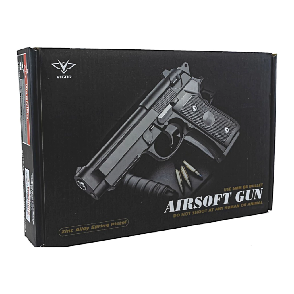 A Vigor VG PT92 V22 é a escolha ideal para quem está iniciando no airsoft e procura uma pistola com excelente custo-benefício, construção robusta e visual realista. Com sistema spring de repetição manual, dispensa o uso de gás ou bateria: basta puxar o ferrolho para preparar o disparo.