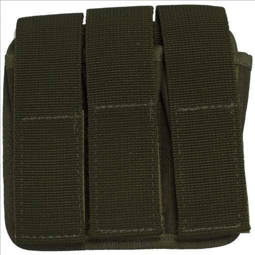 Porta Carregador Triplo Modular. Produzido em nylon cordura na cor Verde Oliva, possui compatibilidade com coletes que possuem sistema MOLLE.