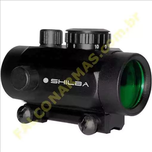 RED DOT SHILBA 1X40RD trilho de 22mm, mira indicada para rifles, carabinas e também para arquearia. Mira para armas curtas ou longas, distância focal livre, resistente à água, retícula de ponto vermelho, com intensidade variável.