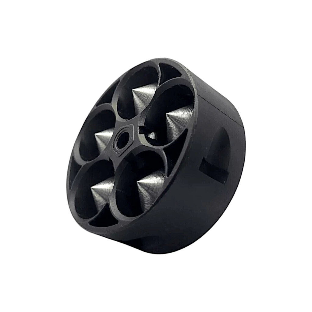 Outro grande diferencial é a ampla compatibilidade com munições calibre .68, como esferas de borracha, alumínio, plástico, paintballs e bolas de pimenta, oferecendo total adaptabilidade a diferentes finalidades. O tambor rotativo removível tem capacidade para 5 disparos consecutivos.