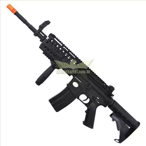 RIFLE DE AIRSOFT DBOYS modelo M4 FULL METAL. Constituído inteiramente em metal, o rifle apresenta um nível de realidade grandioso. Sua alça de mira é ajustável e massa de mira retrátil, para melhor vista de miras holográficas e telescópicas. Coronha possui 5 níveis de regulagem, para um ajuste perfeito. Contém Hand Guard de polímero com trilhos laterais em metal, removíveis. É incluso também uma bandoleira para deslocamentos mais confortáveis e menos cansativos durante os combates. Um grip frontal também se inclui para tiros mais precisos e melhor empunhadura durante os disparos. O seguinte rifle se resume a uma arma completa, direto da loja para os combates. Para finalizar acompanha bateria e carregador de baterias Bi-Volt.